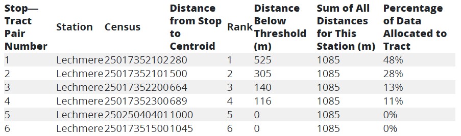 For this station, the allocation for stop-tract pair 1 would be 525/1085, or .48, meaning that 48% of the ridership at Lechmere would be expected from this method to have originated in tract 25017352102, and vice versa for the destination side. So, for every 100 passengers who walk to Lechmere, our methodology predicts that 48 of them came from this tract. For stop-tract pair 5, the centroid is further from the stop than the threshold we set of 804 m or 0.5 miles, so it is ignored in the sum.