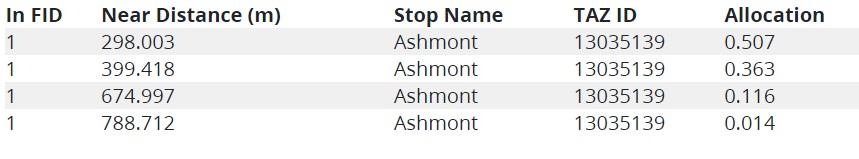 We tallied jobs and population for each TAZ and used the Mean Center tool in Arcmap to find the new center of concentration. This tool finds the gravity-based center of the TAZ- the location where the combined density of jobs and population is the greatest. From there, we calculated and ranked the distance from each bus stop or station to the new centroids within a half-mile. Finally, we determined the proportion of each stop-centroid distance to the sum of all stop-centroid distances and used the same proportions to allocate trip origins and destinations to each stop and corresponding TAZ. The table below shows an example of what the final allocation table might look like. If we applied the proportions shown in the “Allocation” column to X number of trip destinations, the TAZ 13035139 would get about 50 percent of them.