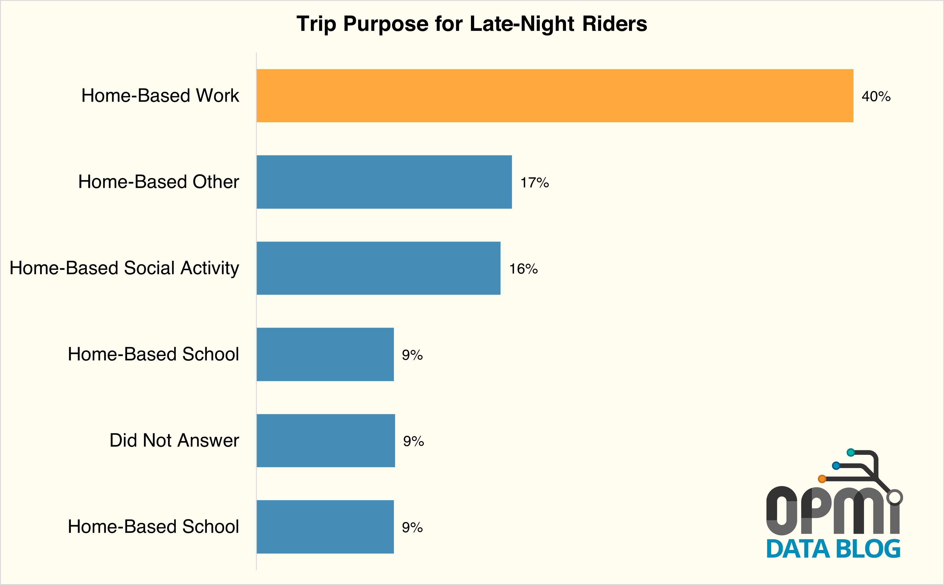 Preliminary analysis of the data has revealed a couple of interesting findings. First, 40% of late-night passengers surveyed responded that their trip was a “Home-based Work” trip. Though a little smaller than the overall system-wide proportion, it is by far the most common trip purpose among late-night riders, and indicates that a large proportion of late-night riders are using the MBTA to get to or from their job (see Figure 1).